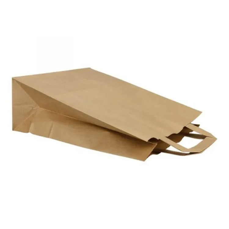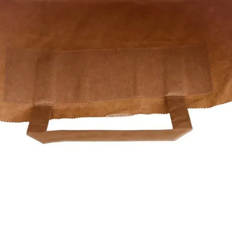 தட்டையான காகிதக் கைப்பிடிகளைக் கொண்ட கிராஃப்ட் பேப்பர் பையை கேட்டரிங் துறையிலும், சூப்பர் மார்க்கெட்டிலும், பரிசுகளிலும் பயன்படுத்தலாம். அவை வலுவான மற்றும் நீடித்த பொருட்களால் ஆனவை, பல முறை மீண்டும் பயன்படுத்தப்படலாம், உரம் மற்றும் மக்கும் தன்மை கொண்டவை.
